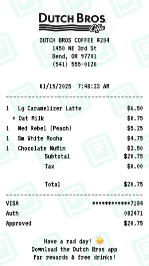 Create coffee shop receipts with our free receipt generator. Templates for Starbucks and cafés—lattes, espresso, pastries, and coffee drinks. Perfect for expense tracking, personal budget records, and office coffee run reimbursement. Download PNG or PDF instantly.