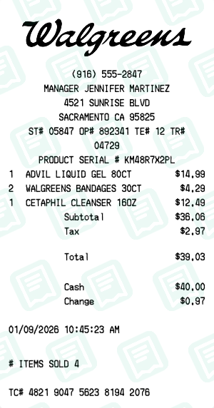 Absolutely! Add loyalty card numbers, member savings, reward points, and coupon discounts. Document total saved and remaining balance. Our pharmacy receipt generator matches CVS, Walgreens, and generic drugstore formats.