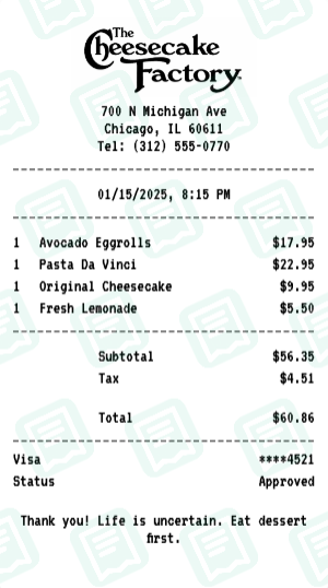 Create restaurant receipts with our free restaurant receipt generator. Over 12 templates including Applebee's, Olive Garden, IHOP, Outback Steakhouse, The Cheesecake Factory, Buffalo Wild Wings, Cracker Barrel, Panera Bread, Baskin-Robbins, and more. Add tip, gratuity, table number, server name, and itemized food and drink orders. Perfect for business meal documentation, expense reports, client dinner receipts, and personal budget tracking. Download PNG or PDF instantly — no signup required.