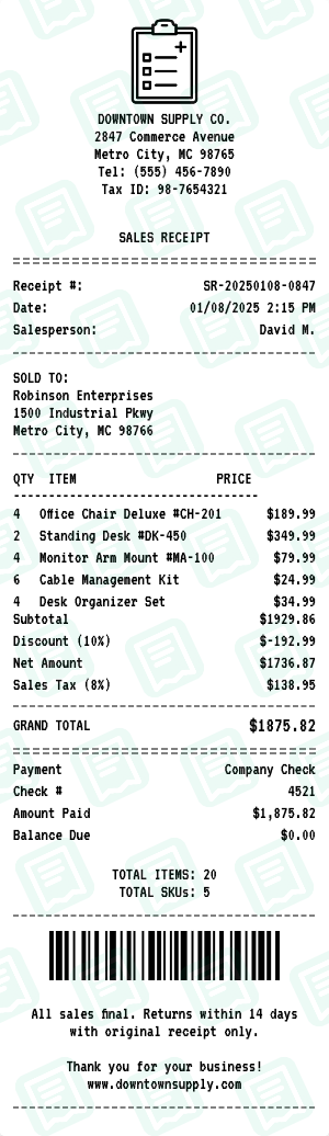 Free online itemized sales receipt generator. Create detailed sales receipts with comprehensive line items, quantities, unit prices, and extended totals. Perfect for retail sales, wholesale transactions, and detailed expense documentation. Features SKU numbers, multiple quantity support, discounts, and complete tax breakdown. Customize all details and export high-quality PNG or PDF. For personal use only.