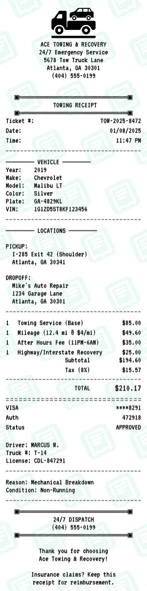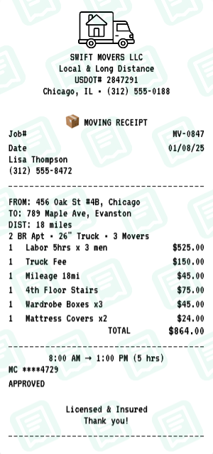 Free online moving receipt generator. Create professional receipts for moving services with labor, truck fees, packing materials, and location details. Perfect for moving companies, movers, and relocation services. Customize all details including crew size, hours, mileage, and special items. Export high-quality PNG or PDF instantly. For personal use only.