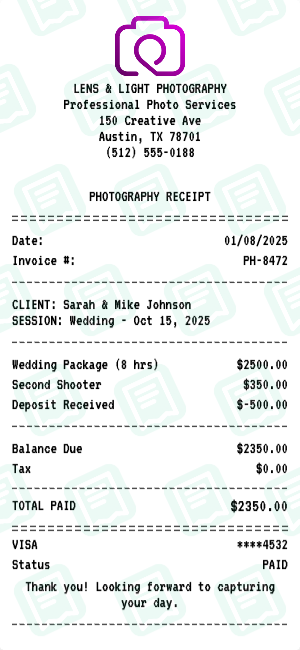 Create photography receipts for weddings, events, portraits, and print orders.